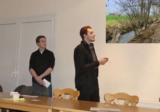 Uli Dellbrügger stellte die drei Schüler des Conrad-von-Soest-Gymnasiums vor. Es wären drei sehr engagierte Schüler der Bio-AG. Sie wären seit der sechsten Klasse zusammen. Die drei Schüler hießen: Jonas Pohlon, Jannis Wibbecke und Julian Herbers. Diese drei haben Renaturierungsprojekte im Kreis Soest begleitet. An der Lippe haben sie mitgearbeitet und waren bei der Möhne mit eingebunden. Sie stellten beim Neujahrsempfang die Untersuchungsergebnisse vom Amper Bach vor.