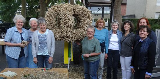 Bei gutem Wetter wurde die gesamte Arbeit dann sogar im Freien, auf dem Parkplatz des Schützenhauses erledigt. Besonderer Dank ging an Heinz und Ingeborg Müller, die rechtzeitig vor dem Einsatz der Mähdrescher dafür gesorgt hatten, dass die Weizenhalme klassisch und in der richtigen Länge geschnitten wurden. Die neue Erntekrone wird am kommenden Sonntag den ökumenischen Erntedank-Gottesdienst um 11.15 Uhr im Schützenhaus schmücken.