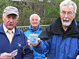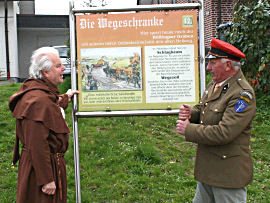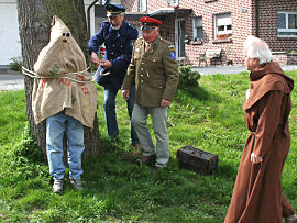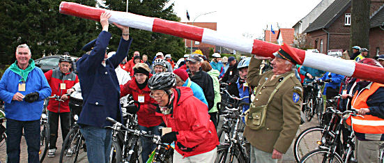 Der Hellweg, der die Weser mit dem Rhein verbindet ist eine der wichtigsten von Osten nach Westen führenden Landverbindungen Nordrhein-Westfalens. Er ist das Teilstück einer mittelalterlichen Fernstraße von Magdeburg bis Aachen. Von Bad Sassendorf-Lohne kommend, wo die alte Trasse noch als eindrucksvoller Hohlweg erhalten ist, führte der Hellweg durch die Soester Innenstadt und verließ diese nach Westen durch das Jakobitor, um über Ampen weiter Richtung Werl zu fahren. Der heutige ausgeschilderte Pilgerweg basiert auf Forschungen der zum Land- schaftsverband Westfalen-Lippe (LWL) gehörigen Altertumskommission für Westfalen. So hält er sich in seinem Verlauf von Höxter über Paderborn und Soest nach Dortmund immer möglichst nah an das historische Vorbild der Hellwegtrasse. In Ampen wurde 2008, anlässlich der 1175-Jahrfeier, der Kulturpfad mit seinen 13 Stationen geschaffen. Und eben dieser alte Hellweg ist auch indirekt ein Bestandteil des historischen Kulturpfades. Ob an der Gerichtslinde mit dem Handweiser (Station 4), an der Wegeschranke (Station 12) oder an der Skulptur Galgenvögel (Station 10), überall dort kreuzen wir den alten Hellweg und somit auch den Pilgerweg. Die dritte Station die der Fahrradtross am Mittwoch, 21. April gegen 11:15 Uhr erreichte, war unsere Station 4, der Schlagbaum. Schon Frühzeitig waren Hans Friedrich, Günter Manske und Friedel Kirchhoff vom Organisationsteam an der Station um die vorbereitenden Arbeiten zu verrichten. Der Schlagbaum wurde so hergerichtet, dass er rauf und runter bewegt werden konnte. Auch mussten die Uniformen angezogen werden, hierbei traf es den armen Günter Manske nicht gerade gut, er schlüpfte in die Rolle des Juwelendiebes und wurde hurtig an den Pranger gebunden.