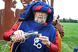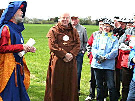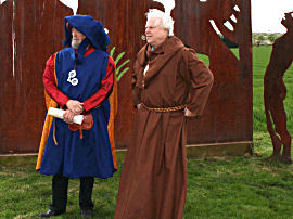 Die nächste Station in der Amper Feldflur war die Skulptur der Galgenvögel. Einen Wegeplan benötigten die Pilger nicht, sah man schon von Weitem die ca. dreieinhalb Meter große Skulptur des Amper Künstlers Fritz Risken. Diese Skulptur gehört zum Kunst-Projekt „Wegmarken", welches in den Jahren 1998 - 2001 für die Kulturregion Hellweg erstellt und vom Land Nordrhein-Westfalen gefördert wurde. „Friedrich von Annepen“ und „Kuttenträger“ Georg Sanke begrüßten die Pilger. Fritz Risken erzählte seine Dönekes, von seiner Schul- und Ausbildungszeit bis hin zu seinen Studienreisen.