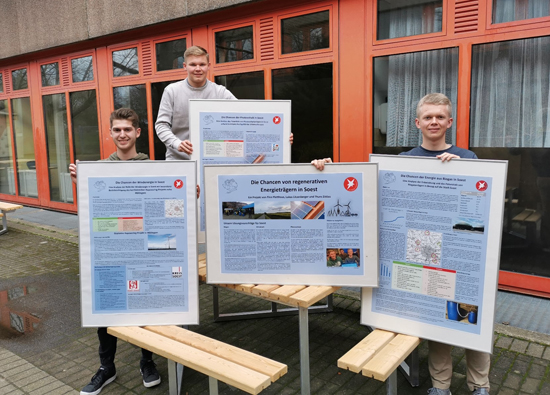 Thure Zittlau, Finn Platthaus und Lukas Litzenberger erhielten mit ihrem Projekt „Die Chancen von regenerativen Energieträgern“ beim Wettbewerb Jugend forscht den Sonderpreis „Energiewende“ des Bundesministeriums für Wirtschaft und Energie. Auch in Soest ist ihre Arbeit auf große Resonanz gestoßen. Sie werden am 23.April im Ausschuss für Umwelt- , Natur- und Klimaschutz über ihre Untersuchungsergebnisse referieren. Auch beim Wettbewerb Demokratisch Handeln waren sie erfolgreich. Sie gehören zu den ausgezeichneten Projekten und werden zur Lernstatt Demokratie 2021 eingeladen und erhalten darüber hinaus einen Sonderpreis und werden zu einem Workshop des Bundesbildungsministeriums im Rahmen der Begabtenförderung eingeladen.