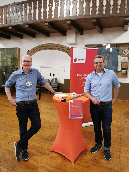 Jörg Radandt (Stadt Soest) und Dominik Hennecke von den Stadtwerken Soest informieren über Glasfasertechnologie.